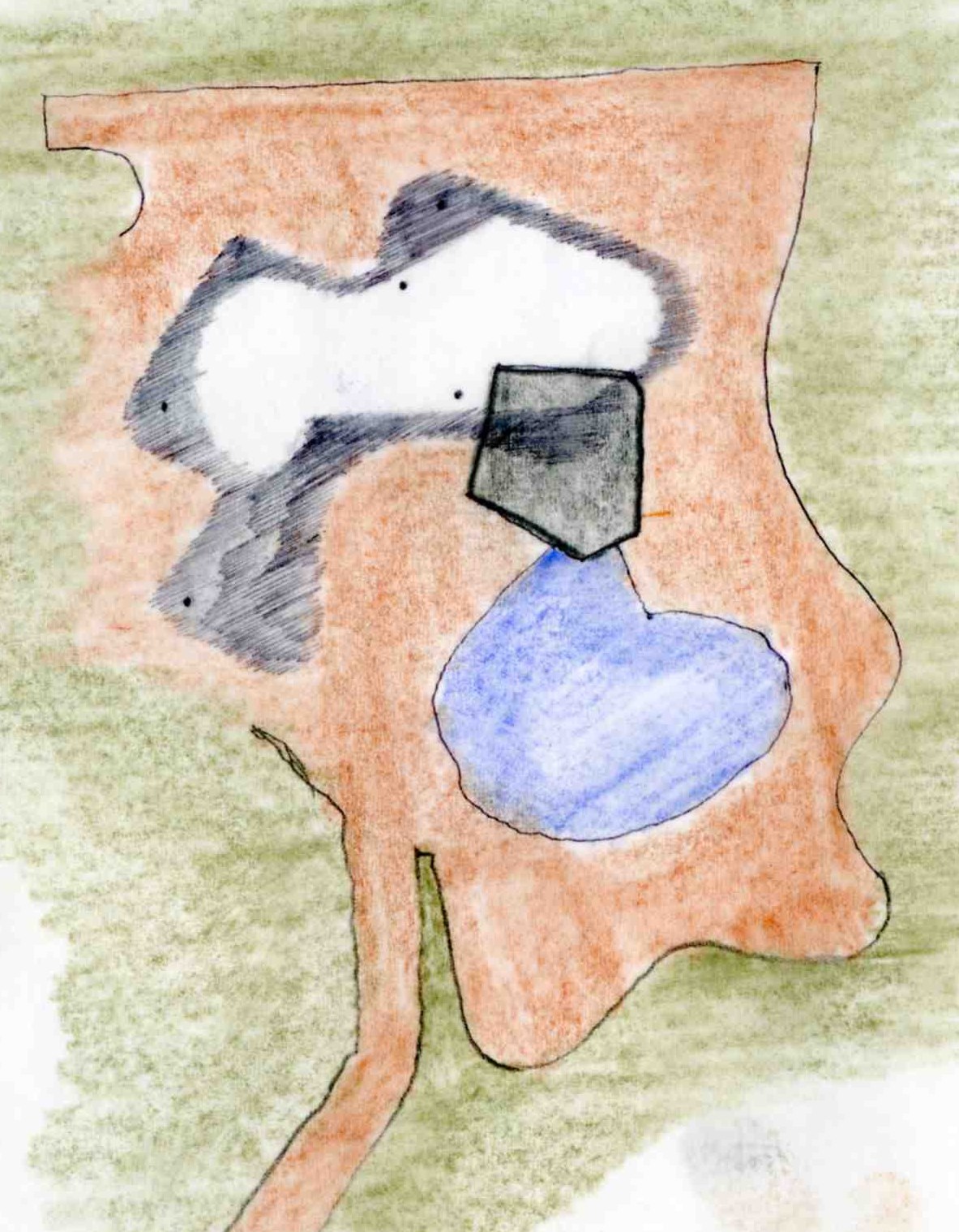 Análoga reflexión podemos hacer sobre la morfología del espacio exterior embaldosado que rodea la casa y la piscina. Su tratamiento formal es sensual, plástico y dinámico, semejante al de la casa. En su espacialidad se conjugan lugares abiertos de permanencia y recorrido de manera continuada, y alternada. La configuración curvilínea de éste recorrido espacial exterior, aparentemente anárquica, posee en esencia una lógica funcional clara, que resulta imperceptible debido a la forma libre de su diseño.